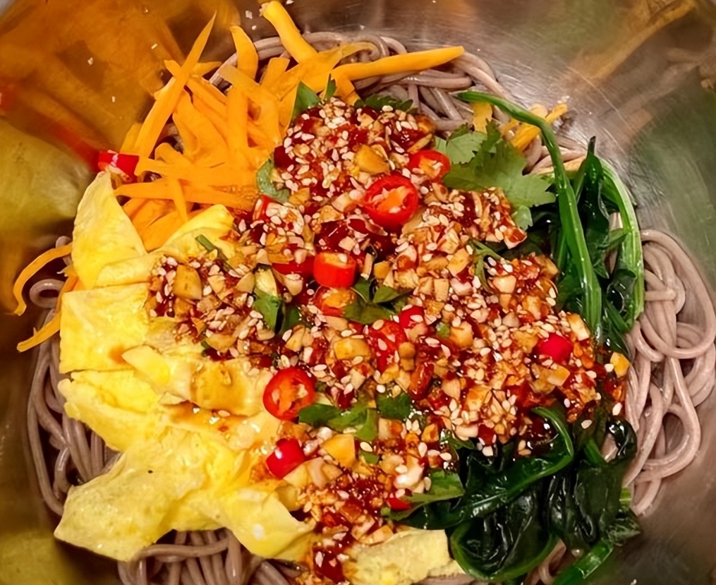 2.荞麦面煮熟捞出过冷水,加入焯水的菠菜、胡萝卜,加入酱汁搅匀完成。